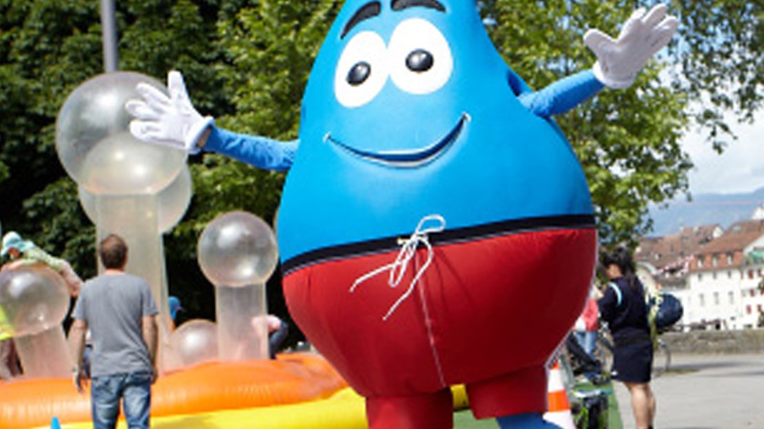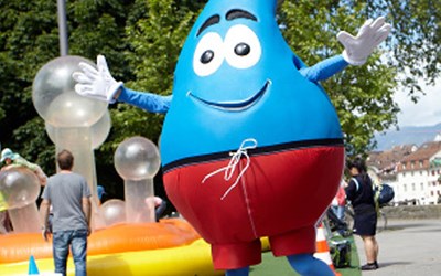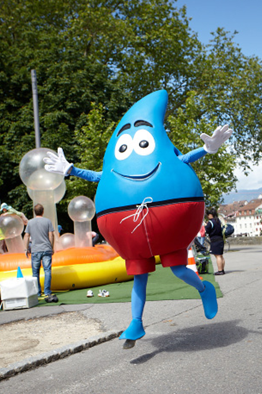 Tropfi macht Kindern und Familien das Wassertrinken schmackhaft. Das Tropfenkostüm kann für Einsätze draussen oder drinnen gemietet werden.