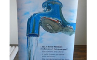 Der aufklappbare Roll-Up mit Tipps zum Wassertrinken eignet sich für Einsätze drinnen wie Elternabende und Standpräsentation zu Wasser, Getränken oder ausgewogener Ernährung.
