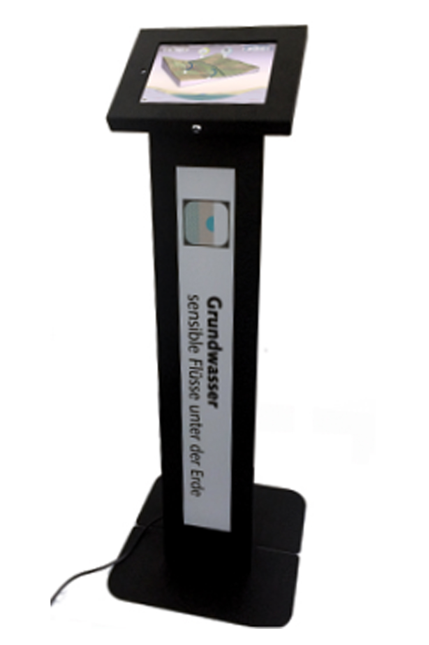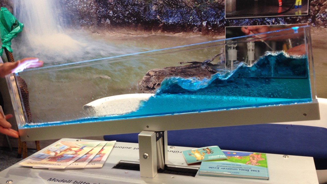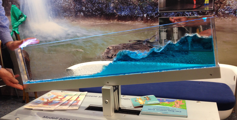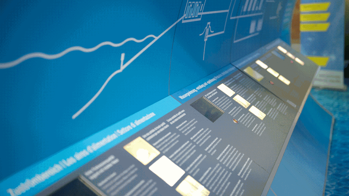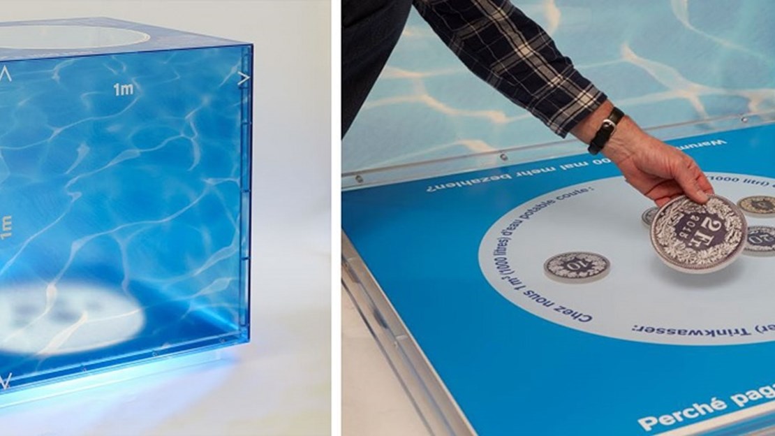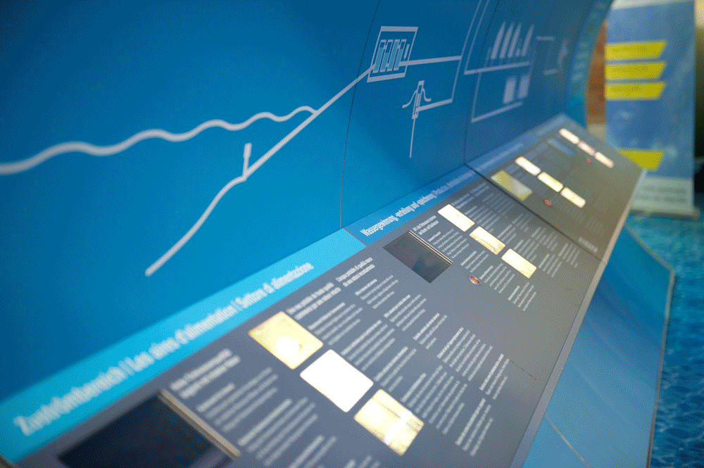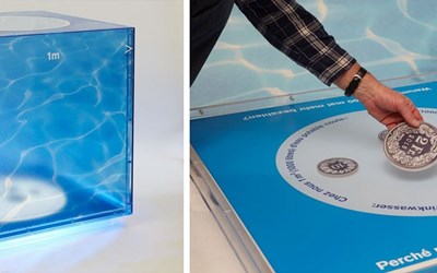 Das ästhetische Exponat aus Acryl mit transparenter Aquafolie und LED-Panel im Sockel ermöglicht die Visualisierung von 1000 Liter und vermittelt Informationen in drei Sprachen zu folgenden Themen: