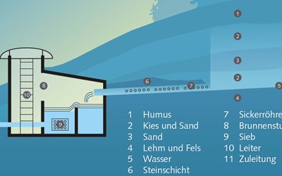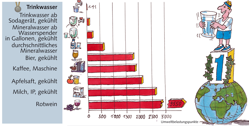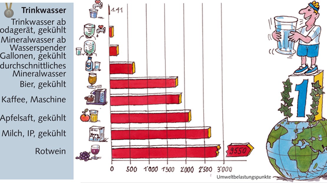 Trinkwasser ist das mit Abstand umweltfreundlichste Getränk. Das zeigt eine Ökobilanz, die der Schweizerische Verein des Gas- und Wasserfaches SVGW 2014 erstellen liess. Sie verglich Trinkwasser mit anderen Getränken und Konsumgütern. Die wichtigsten Ergebnisse hat der SVGW auf vier Postkarten grafisch umsetzen lassen.
