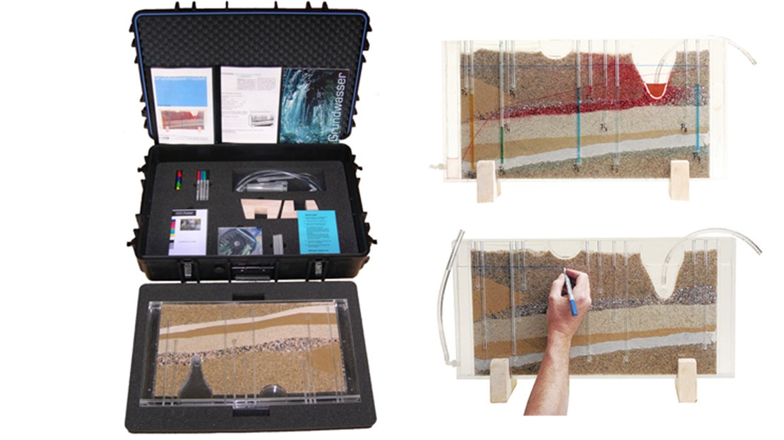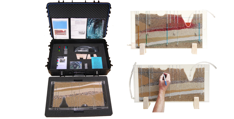 Der Demo-Koffer eignet sich bestens, das Thema Grundwasser interessierten Personen näher zu bringen. Das Herzstück ist ein durchsichtiges Modell aus Acrylglas, welches die abstrakten Vorgänge in der Tiefe auf faszinierende Art und Weise verständlich macht! Mit Hilfe von Wasser und Lebensmittelfarbstoffen kann das verborgene Fliessen des Grundwassers sichtbar und erlebbar gemacht werden.