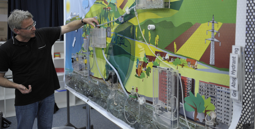 Der Demo-Koffer beinhaltet die wesentlichen Bestandteile eines Trinkwas- serversorgungssystems und zeigt den Weg des Wassers von der Gewinnung aus Grund-, Quell-, und Seewasser über die Aufbereitung und Verteilung bis hin zum Verbraucher. Der Einsatz von Wasser ermöglicht einen realitätsnahen Einblick in das verborgene System Wasserversorgung und sorgt für viel Spass und ein kreatives Lernumfeld.