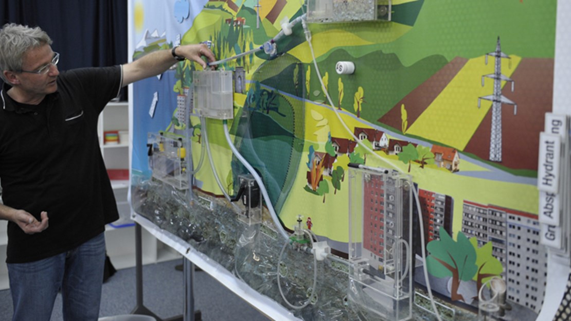 Eine Pumpe bringt Wasser in einer Plexiglasröhre zum Wasserhahn hinauf, Wasser fliesst ausserhalb der Plexiglasröhre in einen Behälter hinunter.