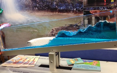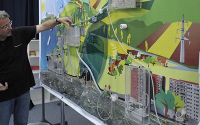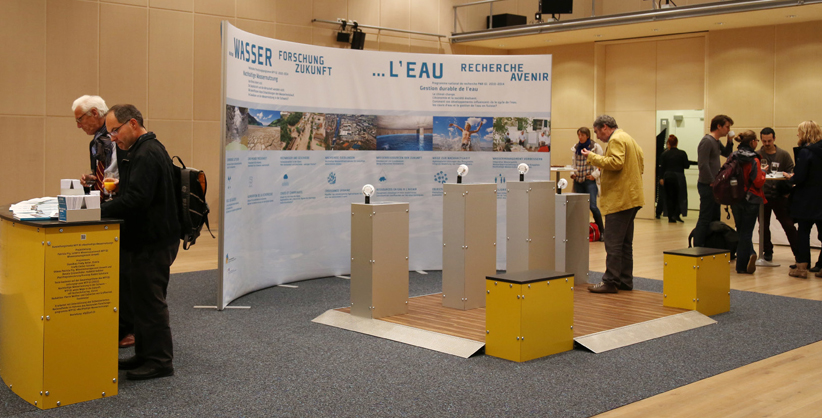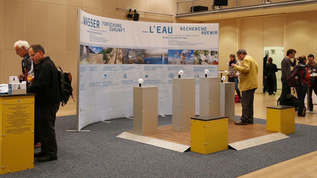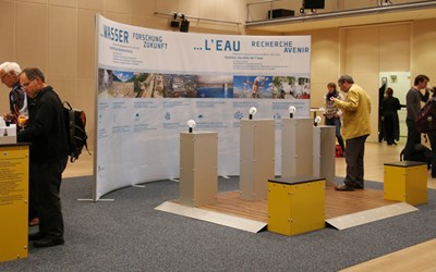 Die wichtigsten Botschaften des Nationalen Forschungsprogramms 61 «Nachhaltige Wassernutzung» wurden in einem Ausstellungsmodul zusammengefasst. An vier Stationen können die Videos «Trailer», «Einblick» und «Ausblick» angeschaut werden.