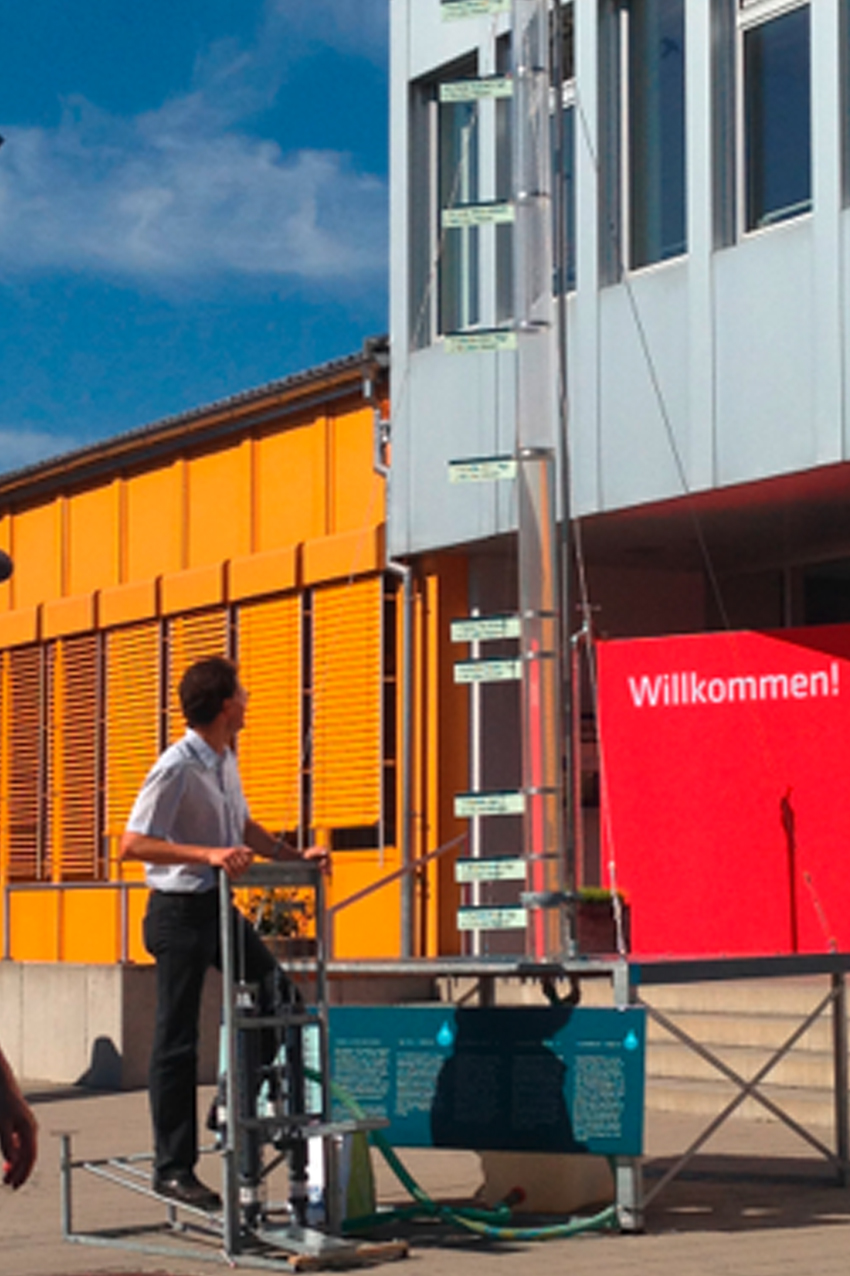 Mit Hilfe einer Tretpumpe kann eine 4 Meter hohe Röhre aus Plexiglas gefüllt werden. Die geförderte Menge Wasser entspricht dem Anteil des virtuellen Wassers, das im jeweils vorgestellten Produkt steckt. Wird nicht mehr gepumpt, entleert sich das Modell. Das Modell benötigt keinen Stromanschluss.