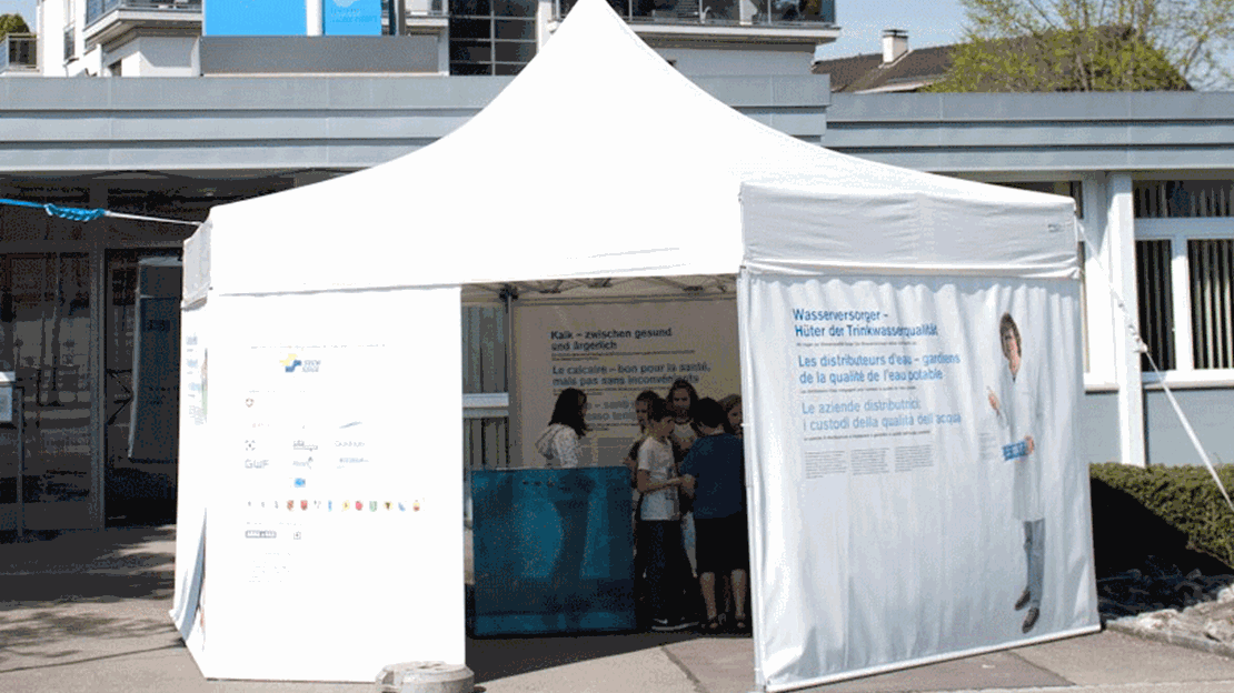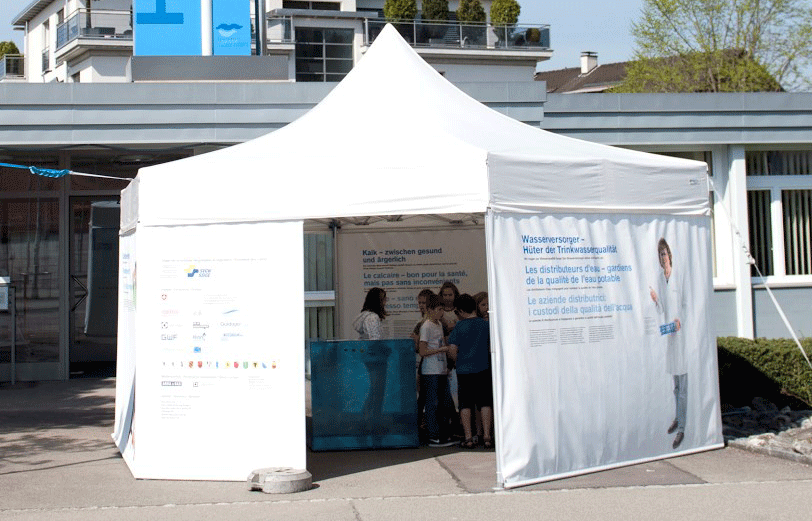 Idee: Im Zelt finden die Besucherinnen und Besucher Informationen in drei Sprachen zur Trinkwasserqualität.