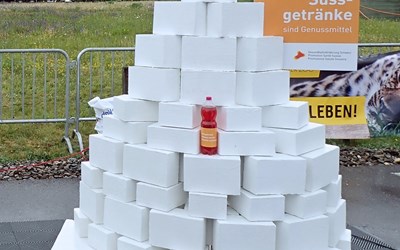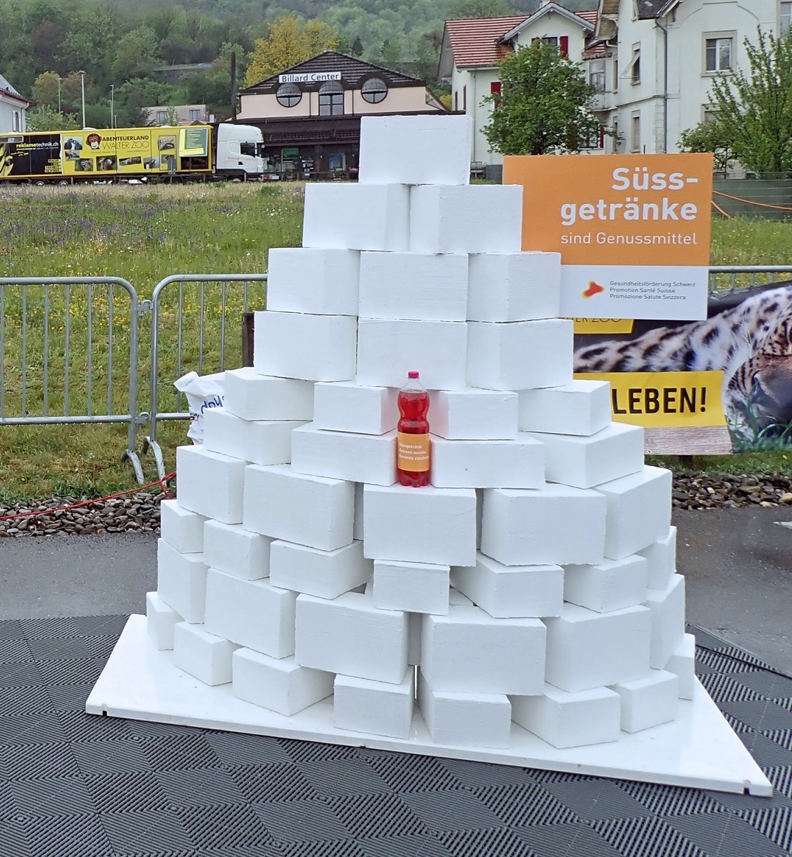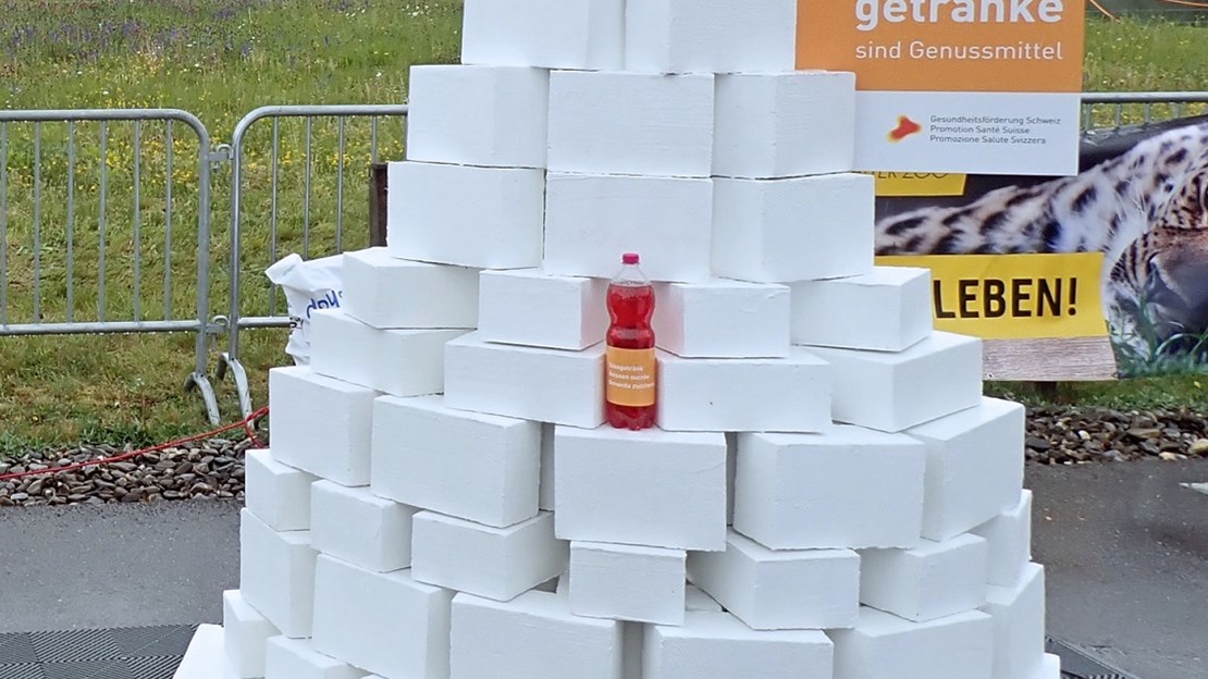 Süssgetränke versus Trinkwasser: Berg aus überdimensionierten Zuckerwürfeln und einer Flasche Süssgetränk. Tafel mit dem Slogan «Süssgetränke sind Genussmittel»