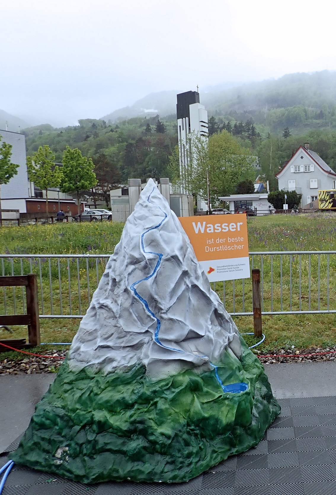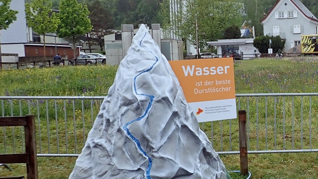 Süssgetränke versus Trinkwasser: Berg mit kleinem Bach und einem Krug Trinkwassser. Tafel mit dem Slogan «Wasser ist der beste Durstlöscher»