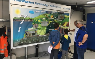 Poster im A1- Format zu den Themen: Schema Wasserversorgung, Wasserverbrauch im Haushalt, Leitungsnetz, Wasserbilanz, Ökobilanz, Ökobilanz Getränke, Grundwasserfassung, Quellwasserfassung, Seewasseraufbereitung, Wasserkreislauf.