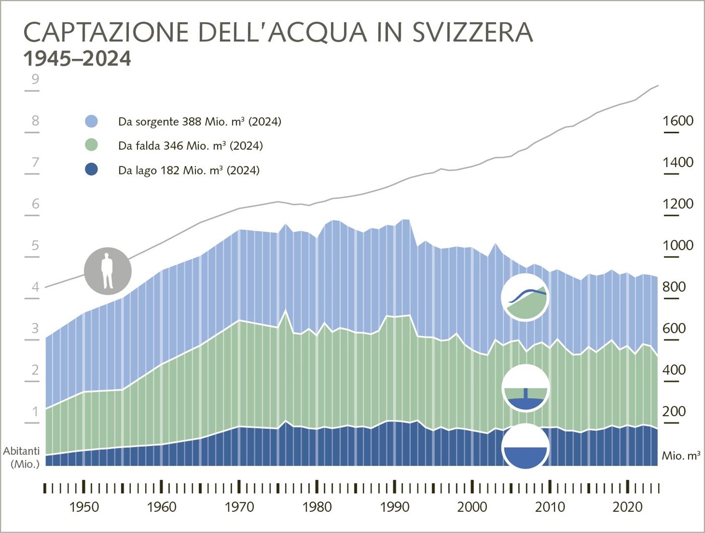 Le risorse idriche sotterranee della Svizzera ammontano a oltre 50 miliardi di metri cubi d'acqua, una quantità pari circa al volume del Lago di Costanza. Esse si concentrano soprattutto nell'area dell'Altopiano.
