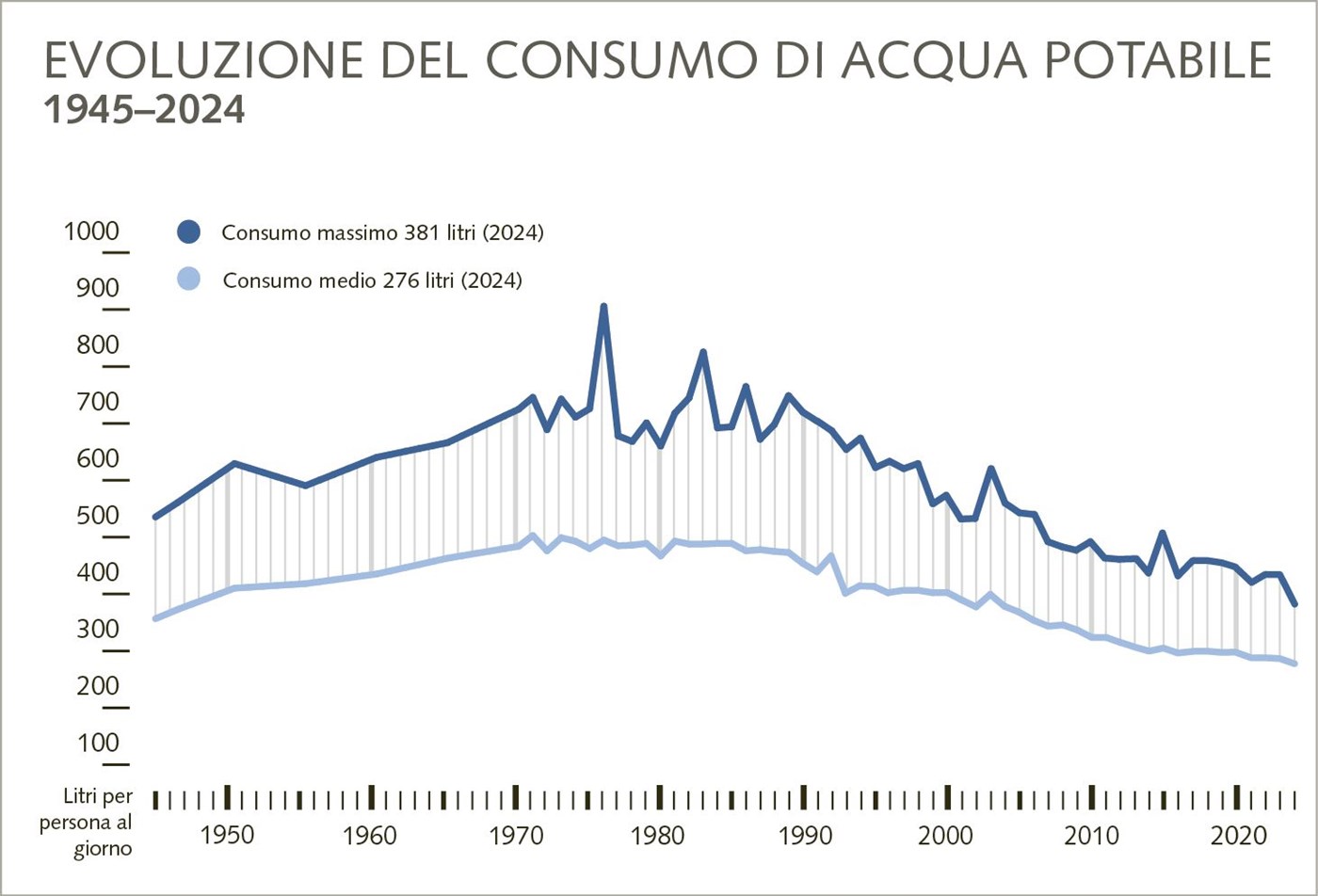 Il consumo totale di acqua potabile in Svizzera è in calo ormai da tempo. Sebbene la popolazione sia in costante aumento, dalla fine degli anni '90 l'utilizzo d'acqua è diminuito di oltre 100 litri per persona al giorno e corrisponde attualmente a circa 300 litri. Oggi, nelle economie domestiche si utilizzano appena 142 litri per persona. Se si aggiunge l’utilizzo di acqua sul lavoro, nel tempo libero e in vacanza, tenendo conto dell’intera popolazione svizzera, il consumo si attesta sui 163 litri di acqua a testa al giorno, a cui va aggiunta un'ingente quantità di acqua virtuale.