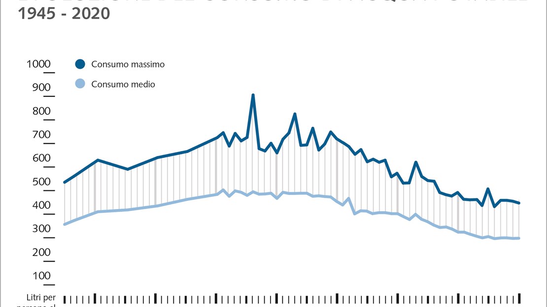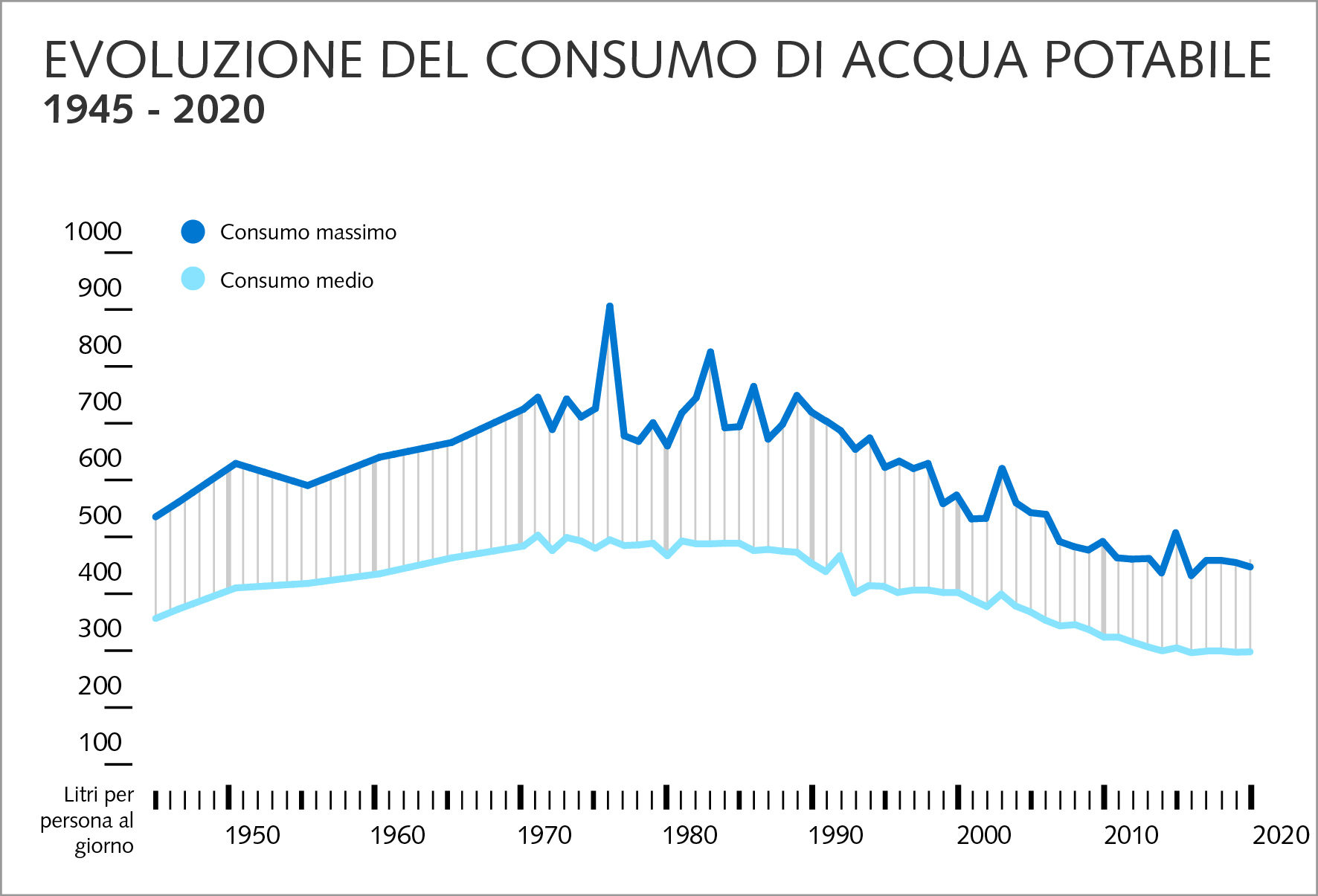 REGISTRAZIONEIl consumo totale di acqua potabile in Svizzera è in calo ormai da tempo. Sebbene la popolazione sia in costante aumento, dalla fine degli anni '90 l'utilizzo d'acqua è diminuito di oltre 100 litri per persona al giorno e corrisponde attualmente a circa 300 litri. Oggi, nelle economie domestiche si utilizzano appena 142 litri per persona. Se si aggiunge l’utilizzo di acqua sul lavoro, nel tempo libero e in vacanza, tenendo conto dell’intera popolazione svizzera, il consumo si attesta sui 163 litri di acqua a testa al giorno, a cui va aggiunta un'ingente quantità di acqua virtuale.