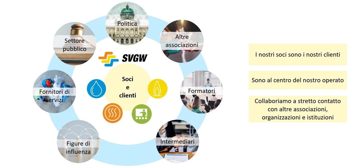 I soci della SVGW non sono solo parte dell’associazione, ma anche la sua clientela più importante e sono quindi al centro del suo operato. Oltre alla politica e al settore pubblico, tra gli stakeholder più importanti della SVGW figurano, in particolare, i fornitori di servizi di settore e gli istituti di formazione. Anche gli intermediari e le figure di influenza rientrano tra i gruppi target principali.