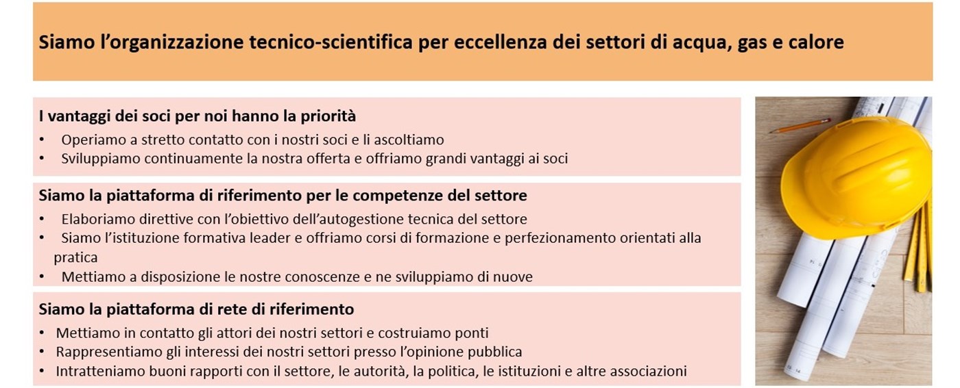 Nella sua veste di organizzazione tecnico-scientifica specializzata nei settori dell’acqua, del gas e del calore, la SVGW orienta coerentemente le proprie attività alle esigenze dei propri soci e della clientela. Sviluppa nuovi prodotti e servizi, funge da piattaforma centrale delle conoscenze e crea ponti che uniscono gli operatori del settore agli stakeholder dell’industria, della politica e della società.